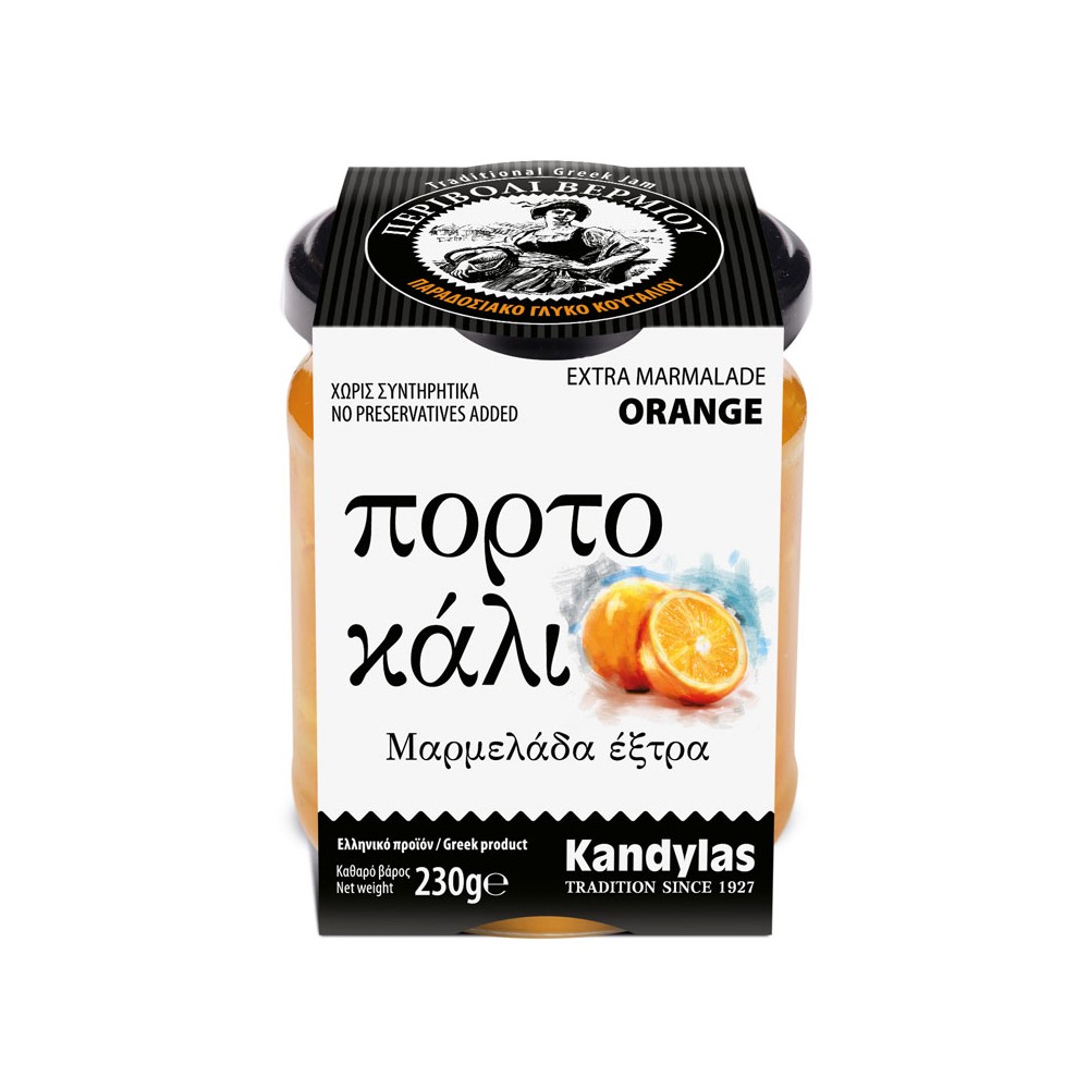 Extra Jams KANDYLAS are produced after a very strict selection of excellent quality Greek fruits. Our jams are extra because the content of fruits inside the jam is higher than 55% and of course, preservatives are not included. Extra jam orange contents more than 55% of Greek fruits.
