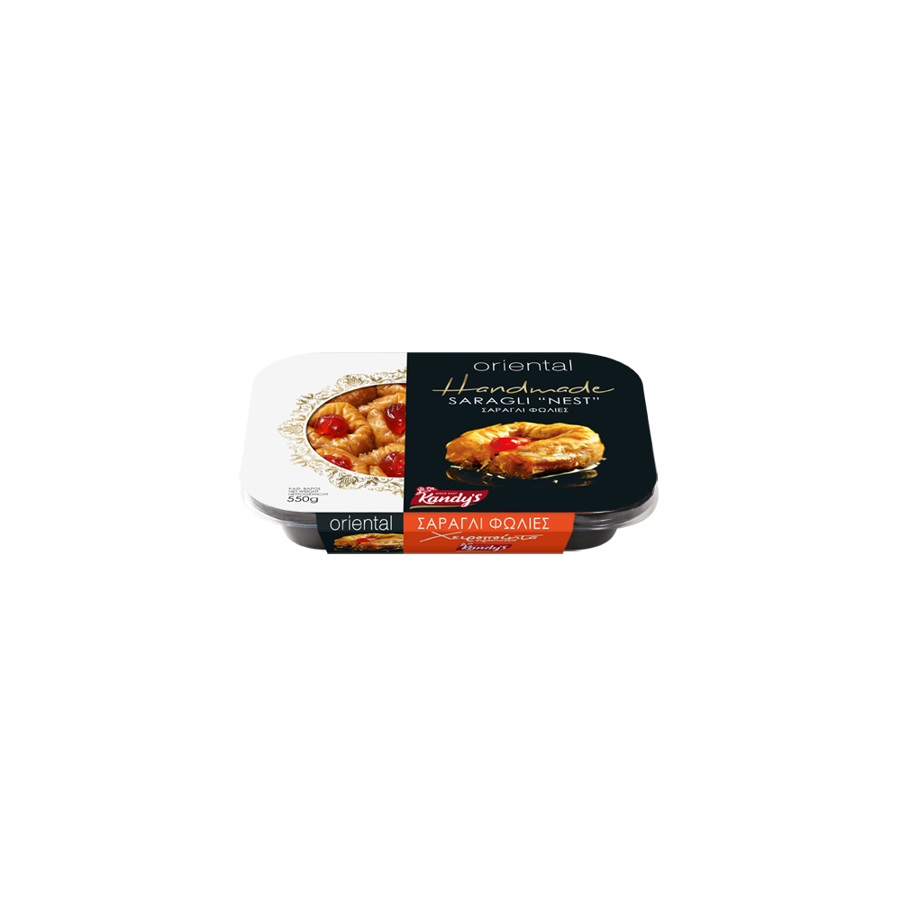 Always with respect to the costumers and the good quality, we choose the best raw materials for our production of the KANDYLAS syrup pastries. Fresh butter, excellent nuts, and crunchy pastry fillo gives saragli ‘’nest’’ this unique taste and flavor.